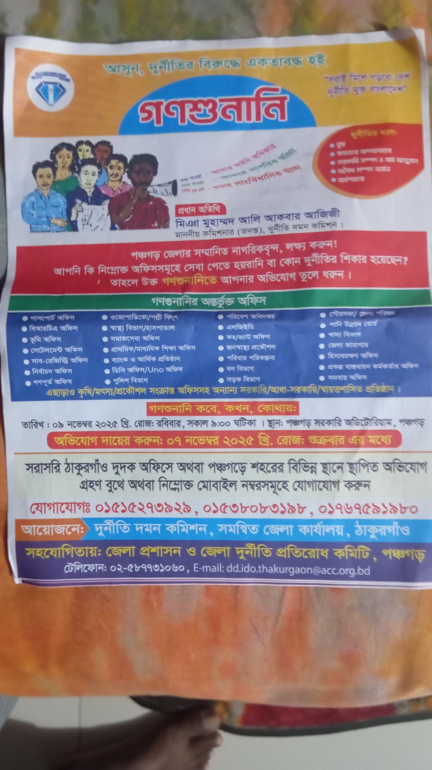 ‘সবাই মিলে গড়বো দেশ, দুর্নীতি মুক্ত বাংলাদেশ’ এই স্লোগানে পঞ্চগড় জেলা সদরে অবস্থিত সরকারি, আধা-সরকারি, স্বায়ত্বশাসিত দপ্তর, ব্যাংক ও আর্থিক প্রতিষ্ঠানে ঘুষ, দুর্নীতি ও হয়রানির শিকার নাগরিকদের সরাসরি অভিযোগ শুনবে দুর্নীতি দমন কমিশন (দুদক)। আগামী ০৯ নভেম্বর, ২০২৫ খ্রি. সকাল ১০টায় পঞ্চগড় সরকারি অডিটোরিয়ামে পঞ্চগড়-এ বিভিন্ন সরকারি দপ্তরে সেবা পেতে হয়রানি বা ঘুষ, দুর্নীতির শিকার সেবা প্রত্যাশী জনসাধারণ এবং সেবা প্রদানকারী সরকারি দপ্তরের উর্ধ্বর্তন কর্মকর্তাগণের অংশগ্রহণে এ গণশুনানি অনুষ্ঠিত হবে।