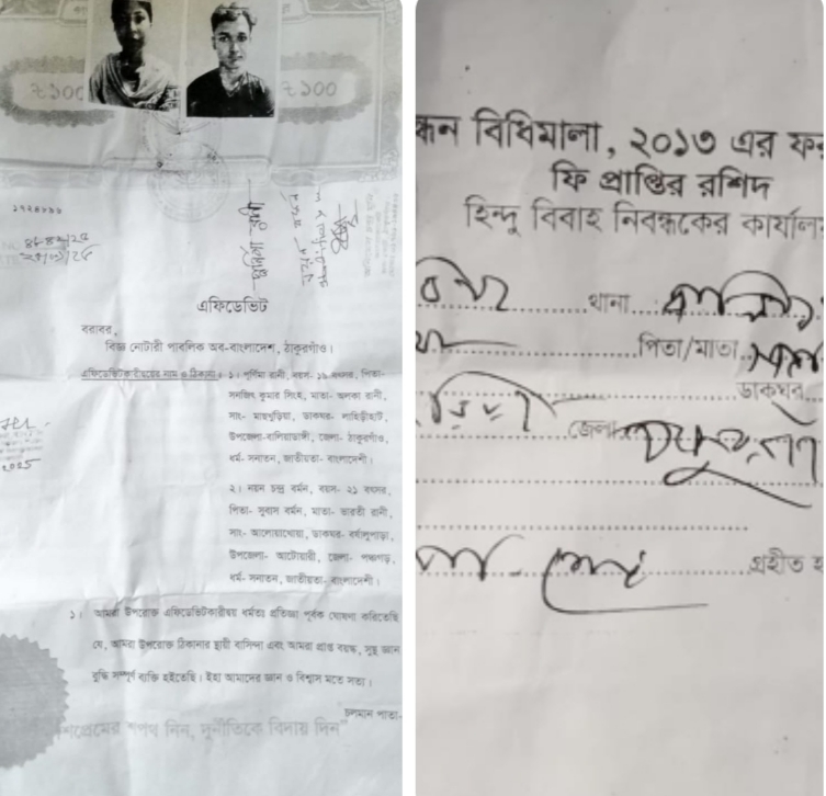 পঞ্চগড় আটোয়ারী প্রতিনিধি:পঞ্চগড়ের আটোয়ারীতে আলোয়াখোয়া ইউনিয়নের ঝাঁকোয়া পাড়া গ্রামের শ্রী সুবাস বর্মন এর ছেলে, নয়ন চন্দ্র বর্মন পূর্ণিমা রানী(১৮) নামের এক যুবতীর সাথে ৬ মাস যাবত প্রেমের সম্পর্ক গড়ে ওঠে, তারই প্রেক্ষিতে বিজ্ঞ নোটারি পাবলিক ঠাকুরগাঁওয়ে এফিডেভিট করে,হিন্দু সম্প্রদায়ের নিয়ম অনুযায়ী হিন্দু বিবাহ নিবন্ধন এর মাধ্যমে তাদের বিয়ে সম্পন্ন হয়।