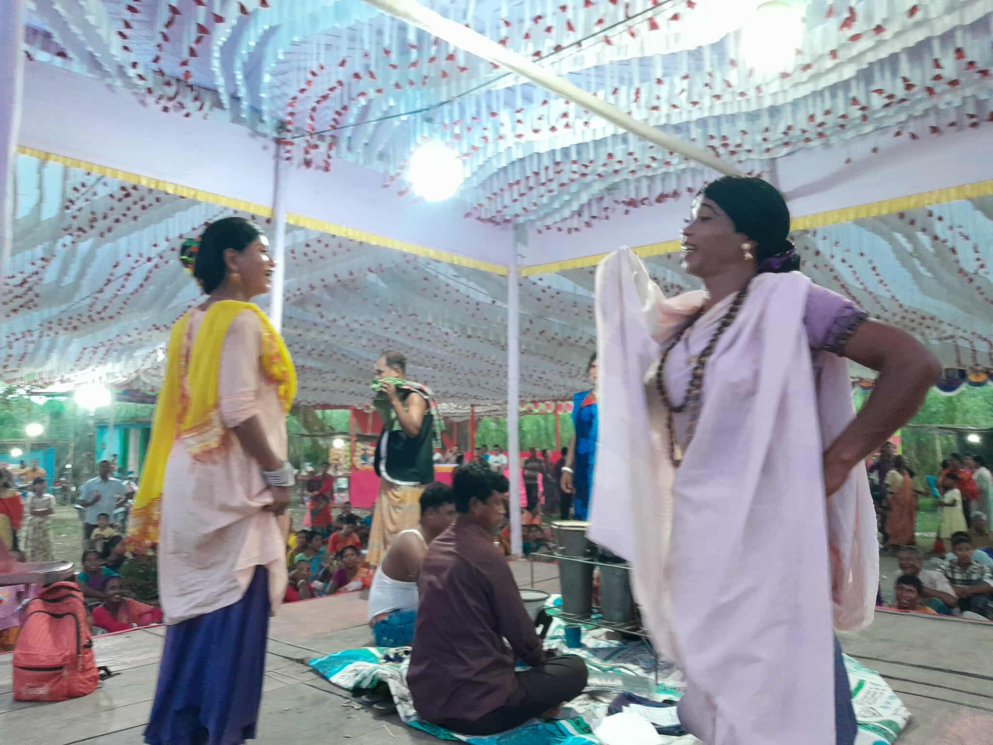 ধামের গানের মজার ব্যাপার হলো- নাটকের বিভিন্ন নারী চরিত্রে পুরুষরাই মহিলাদের কাপড় পরে লম্বা চুলের ঝুঁটি, মাথায় খোঁপা, নাকে নাকফুল, কানে দুল পরে অভিনয় পরিবেশন করে। তাদের চেনা দায় হয়ে পড়ে। ধামের গানে পুরুষ চরিত্রটি যেন এক অপূর্ব সৃষ্টি। দর্শকদের আনন্দ দেয়ার জন্য ছেলেরা মেয়ের পোশাক পড়ে অভিনয় করার কথা স্বীকার করেন খলিসাকুড়ি এলাকার ধামের ঘান শিল্পী নিরঞ্জন। পুরুষ চরিত্রটি হাস্যরস্য, কৌতুক রসে ভরা থাকে। কখনও বখাটে ছেলে, কখনও উপহাসের পাত্র। এসব গান শুরু হলে গ্রামের নারী পুরুষ বৃদ্ধ সকলে মাটিতে বসে মনোযোগ দিয়ে গান উপভোগ করে। এর কদর সারা জেলায়।