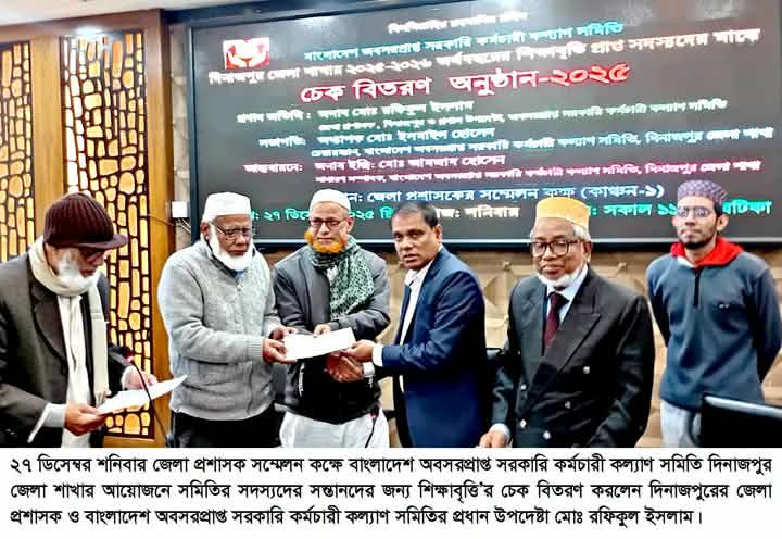 মোঃ জাহিদ হোসেন , দিনাজপুর প্রতিনিধি॥ ২৭ ডিসেম্বর -২০২৫ শনিবার দিনাজপুর জেলা প্রশাসকের সম্মেলন কক্ষে বাংলাদেশ অবসরপ্রাপ্ত সরকারি কর্মচারী কল্যাণ সমিতি দিনাজপুর জেলা শাখার আয়োজনে সমিতির সদস্য সন্তানদের জন্য শিক্ষাবৃত্তি’র চেক বিতরণ করলেন দিনাজপুরের জেলা প্রশাসক ও বাংলাদেশ অবসরপ্রাপ্ত সরকারি কর্মচারী কল্যাণ সমিতির প্রধান উপদেষ্টা মোঃ রফিকুল ইসলাম।