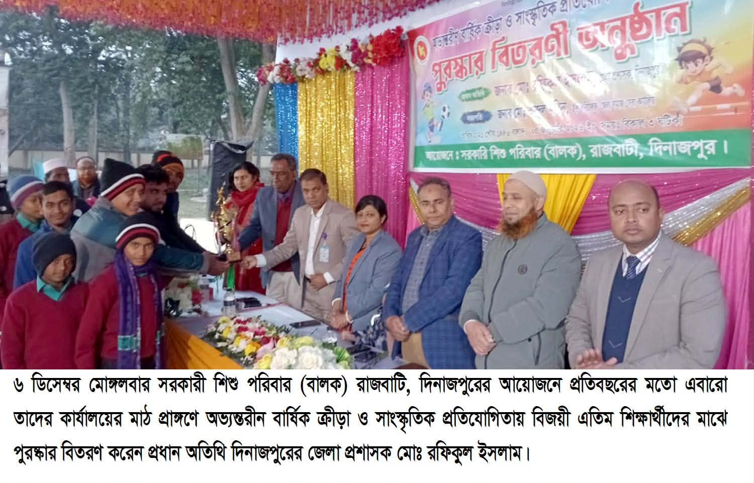 ৬ ডিসেম্বর মোঙ্গলবার সরকারী শিশু পরিবার (বালক) রাজবাটি, দিনাজপুরের আয়োজনে প্রতিবছরের মতো এবারো তাদের কার্যালয়ের মাঠ প্রাঙ্গণে অভ্যন্তরীন বার্ষিক ক্রীড়া ও সাংস্কৃতিক প্রতিযোগিতায় বিজয়ী এতিম শিক্ষার্থীদের মাঝে পুরষ্কার বিতরণ করতে গিয়ে তিনি প্রধান অতিথির বক্তব্যে এ কথাগুলো বলেন। জেলা সমাজসেবা কার্যালয়ের উপ-পরিচালক মোঃ আব্দুল মতিন এর সভাপতিত্বে স্বাগত বক্তব্য রাখেন সরকারী শিশু পরিবার (বালক) এর উপতত্বাবধায়ক মাহমুদা নুসরাত জাহান। বিশেষ অতিথি হিসেবে দিনাজপুর সদর উপজেলা নির্বাহী অফিসার তমলিকা পাল, জেলা সমাজসেবা কার্যালয়ের সহকারী পরিচালক মোঃ মুনির হোসেন, শহর সমাজসেবা অফিসার মোঃ মাইনুল ইসলাম ও উপজেলা সমাজসেবা অফিসার গোলাম আযম। সভাপতির বক্তব্যে জেলা সমাজসেবা কার্যালয়ের উপ-পরিচালক মোঃ আব্দুল মতিন বলেন, পূর্বের চেয়ে সরকারী শিশু পরিবার (বালক) প্রতিষ্ঠানে জেলা প্রশাসকের সহযোগিতায় অনেক উন্নয়ন হচ্ছে। শিক্ষার্থীরা পড়াশোনার পাশাপাশি ক্রীড়া, সাংস্কৃতিক চর্চা ও নৈতিক শিক্ষায় শিক্ষিত হচ্ছে। সরকারী নীতিমালার মাধ্যমে তাদের যত্ন সহকারে পরিচর্যা করা হচ্ছে। সঞ্চালকের দায়িক্ত পালন করেন কারিগরি প্রশিক্ষক ফামিদা খাতুন।