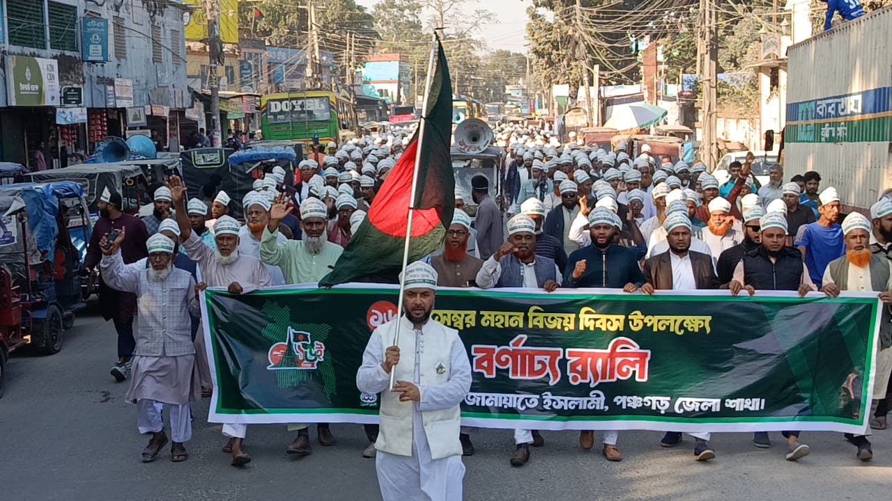 পঞ্চগড়ে মহান বিজয় দিবস উপলক্ষে বর্ণাঢ্য শোভাযাত্রা করেছে জামায়াতে ইসলামী। মঙ্গলবার (১৬ ডিসেম্বর) বিকেলে জেলা শহরে শোভাযাত্রাটি অনুষ্ঠিত হয়। জেলা জামায়াতের আয়োজনে শহরের আদালত এলাকা থেকে শুরু হওয়া শুভযাত্রাটি প্রধান সড়ক প্রদক্ষিণ করে চৌরঙ্গী মোড়ে এসে সংক্ষিপ্ত সমাবেশে অংশ নেয়।