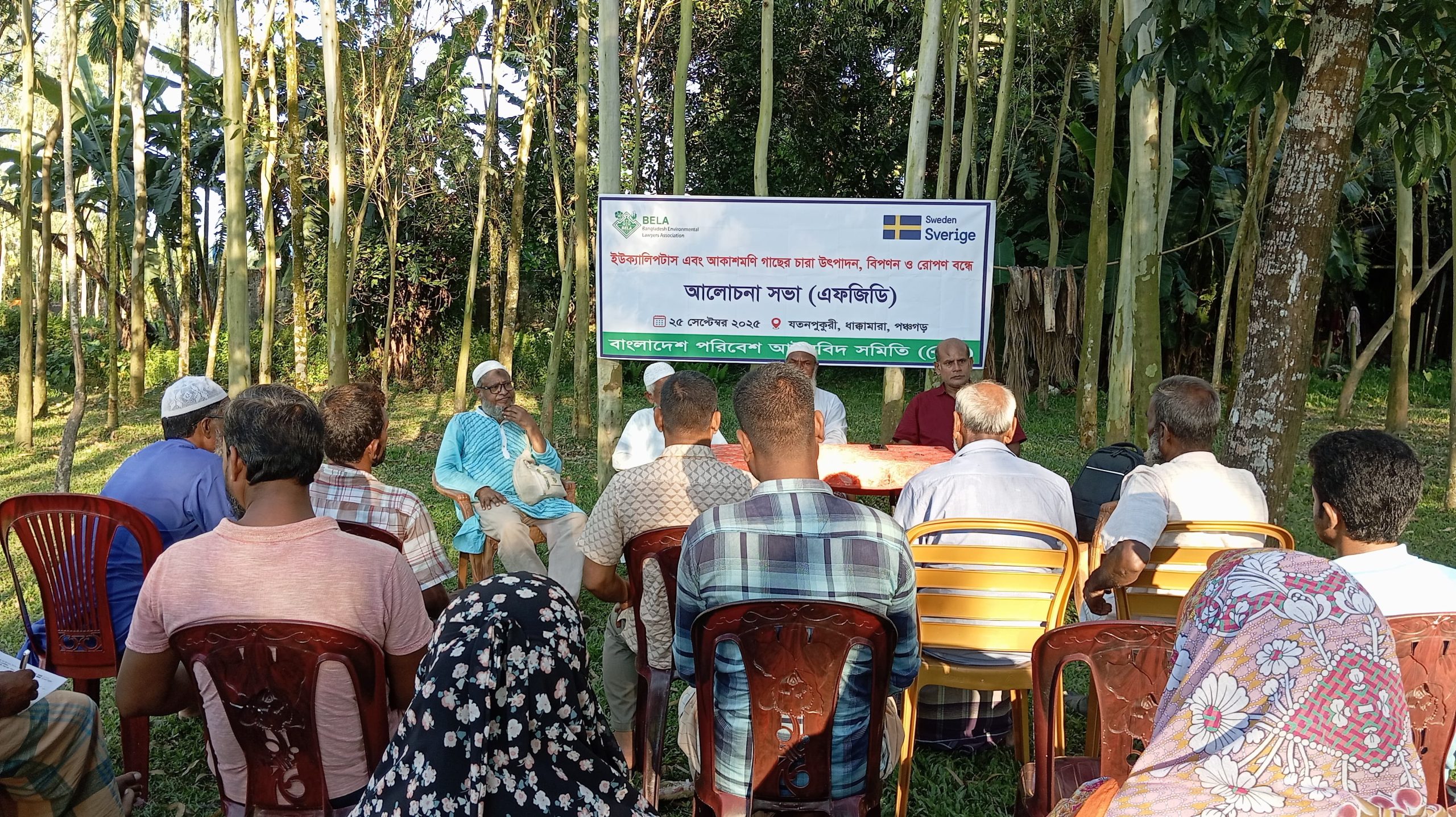 এফ জিডি অনুষ্ঠানে অংশগ্রহণকারীরা ইউক্যালিপটাস এবং আকাশমনি গাছের বিভিন্ন ক্ষতিকর দিক তুলে ধরেন। তারা বলেন যে জমির ধারে ইউক্যালিপটাস গাছ আছে সেই জমিতে ফলন কমে যায়। এছাড়াও তারা বলেন পুকুরে মাছ চাষ করলে পুকুর পাড়ে যদি ইউক্যালিপটাস গাছ থাকে তাহলে ইউক্যালিপটাস এর পাতার কারণে পুকুরের পানি নষ্ট হয় এবং মাছের উৎপাদন কমে যায়। অনেক ক্ষেত্রে মাছ মারাও যায়। ইতিমধ্যে ইউক্যালিপটাস এবং আকাশমনি গাছের চারা উৎপাদন বিপণ এবং রোপন বন্ধে সরকার পরিপত্র জারি করেছে। অংশগ্রহণকারীরা আরও বলেন, আমরা এখন থেকে আর ইউক্যালিপটাস এবং আকাশমনি গাছ লাগাবো না। বিকল্প হিসাবে দেশি জাতের বনজ, ফলজ এবং ঔষধি গাছ লাগাতে হবে। সভায় বাংলাদেশ পরিবেশ আইনবিদ সমিতি (বেলা) আয়োজিত সভায় পঞ্চগড় সদরের যতনপুকুরি গ্রামের কৃষক, ব্যবসায়ী, সাংবাদিক, মৎস্যজীবীসহ বিভিন্ন পেশার মানুষ উপস্থিত ছিলেন। #