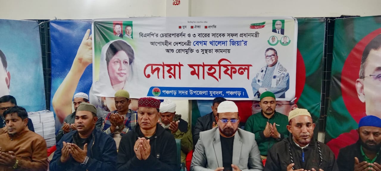 ইনসান সাগরেদ পঞ্চগড় প্রতিনিধি :পঞ্চগড়ে বিএনপির চেয়ারপার্সন বেগম খালেদা জিয়ার রোগ মুক্তির কামনায় দোয়া অনুষ্ঠিত হয়েছে। রোববার সন্ধায় (৩০ নভেম্বর ২০২৫) পঞ্চগড় জেলা বিএনপির দলিয় কার্যালয়ে সদর উপজেলা যুবদলের উদ্যোগে সাবেক তিন তিন বারের সফল নির্বাচিত প্রধানমন্ত্রী ও বাংলাদেশ জাতীয়তাবাদি দল বিএনপি'র চেয়ারপার্সন বেগম খালেদা জিয়া'র আশু রোগ মুক্তির কামনায় দোয়া অনুষ্ঠিত হয়েছে। এ সময় উপস্থিত ছিলেন পঞ্চগড় জেলা বিএনপির যুগ্ন আহবায়ক ও সাবেক স্পিকার ব্যারিস্টার জমির উদ্দিন সরকারের ব্যক্তিগত সহকারী এম এ মজিদ, সাবেক যুবদলের সভাপতি ও পঞ্চগড় জেলা বিএনপির যুগ্ন আহ্বায়ক এ্যাড.মির্জা নাজমুল ইসলাম কাজল, সদর উপজেলা যুবদলের সভাপতি মো:শাহিনুর ইসলাম (শাহীন), সাধারণ সম্পাদক মোজাহারুল ইসলাম( রাজু),সিনিয়র সহ সভাপতি জাকির হোসেন সেলিম,সিনিয়র যুগ্ন সাধারণ সম্পাদক ময়নুল ইসলাম মুন্না, সাংগঠনিক সম্পাদক রুহুল আমিন রুহুল,যুবনেতা হারুন অর রশীদ হারুন,যুব নেতা মেজবাহ উদ্দিন বসুনিয়া জিম সহ যুবদলের নেতা কর্মি'রা।এদিকে বিএনপি নির্বাহী কমিটির আন্তর্জাতিক সম্পর্ক বিষয়ক সম্পাদক ব্যারিস্টার নওশাদ জমিরের নির্দেশনায় পঞ্চগড়ে ৮০ টি মসজিদে বাদ এশা বিএনপির চেয়ারপার্সন বেগম খালেদা জিয়ার রোগ মুক্তির জন্য দোয়া মাহফিল করা হয়।