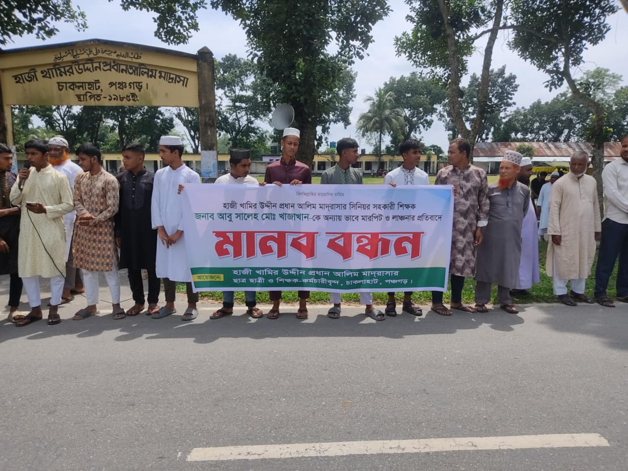 বুধবার সদর উপজেলার চাকলাহাট হাজী খামির উদ্দিন প্রধান আলিম মাদ্রাসা ও টুনিরহাট শহীদ জিয়াউর রহমান ডিগ্রি কলেজের সামনে পঞ্চগড়- চাকলাহাট সড়কে মানববন্ধন কমসূচি করে। গত ৮ সেপ্টেম্বর মাদ্রাসা শিক্ষক আবু মো. সালেহ খাজা খানের পুকুরে কে বা কারা বিষ প্রয়োগে প্রায় লক্ষাধিক টাকার মাছ মেরে ফেলে। খবর পেয়ে শিক্ষক এ ঘটনায় চিৎকার করে কান্নাকাটি চিৎকার চেঁচামেচি করতে থাকে। এসময় কতিপয় দুষ্কৃতকারী ওই শিক্ষককে প্রাণে হত্যার জন্য মারধর করে। লতিফুল নামে স্থানীয় এক ব্যক্তি উক্ত শিক্ষককে আশঙ্কাজনক অবস্থায় দেখে দ্রুত পঞ্চগড় সদর আধুনিক হাসপাতালে ভর্তি করেন। উক্ত লতিফুল মানবিক কারণে উক্ত শিক্ষককে হাসপাতালে ভর্তি করে বাসায় ফেরার পথে দুষ্কৃতকারীরা তাকেও বেদম প্রহার করে। লতিফুলকেও পঞ্চগড় সদর আধুনিক হাসপাতালে ভর্তি হয়ে চিকিৎসা নিচ্ছে। এলাকার সুধীজন, শিক্ষক শিক্ষার্থীরা দোষীদের দৃষ্টান্তমুলক বিচার দাবি করেছেন। মানববন্ধনে বক্তব্য রাখেন পঞ্চগড় জেলা মাদ্রাসা শিক্ষক সমিতির সভাপতি মৌলানা মো. সাইফুল্লাহ, মাদ্রাসা কর্মচারী রংপুর বিভাগীয় ফেডারেশনের সভাপতি মো. রফিকুল ইসলাম। হাজী খামির উদ্দিন প্রধান আলিম মাদ্রাসার ভাইস প্রিন্সিপাল মো. আনসারুল ও শিক্ষার্থী ও অভিভাবকরা । বক্তারা এ ঘটনার তীব্র নিন্দা ও অপরাধীদের দৃষ্টান্তমূলক শাস্তির দাবি করেন। অন্যথায় এ আন্দোলন শুধু পঞ্চগড়ে নয় সমগ্র বাংলাদেশে শিক্ষক সমাজ ও ছাত্রদের