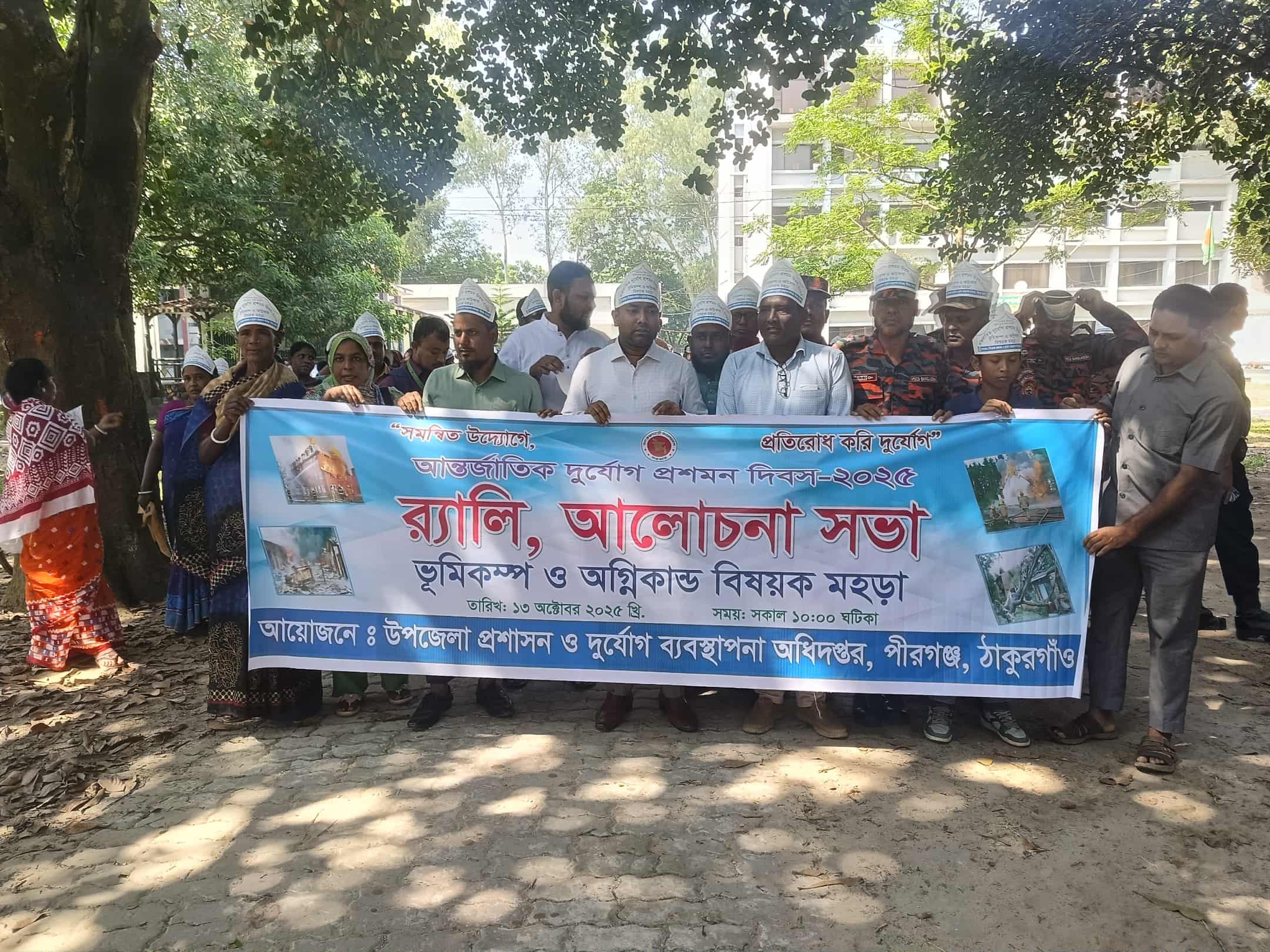 শেখ সমশের আলী, পীরগঞ্জ, ঠাকুরগাঁও, প্রতিনিধি।। ঠাকুরগাঁওয়ের পীরগঞ্জে সোমবার সকাল ১১টায় উপজেলা পরিষদ মাঠে আন্তর্জাতিক দূর্যোগ প্রশমন উপলক্ষে বেশ কিছু কর্মসূচী পালিত হয়েছে। অগ্নিকান্ড নিয়ন্ত্রণের কৌশল সম্পর্কে প্রশিক্ষণ দেওয়া হয়। ফায়ার সার্ভিস ও সিভিল ডিফেন্স কতৃর্পক্ষ প্রশিক্ষণ দেয়। আন্তর্জাতিক দূর্যোগ প্রশমন দিবস উপলক্ষে পীরগঞ্জ উপজেলা প্রশাসন ও দূর্যোগ ব্যবস্থাপনা অধিদপ্তর শহরে বর্ণাঢ্য র্যালী, আলোচনা সভা, ভূমিকম্প ও অগ্নিকান্ড বিষয়ক মহরা প্রদর্শন করেন। ওই সময় উপজেলা নির্বাহী অফিসার মোঃ রকিবুল হাসান, আল হাসানা স্কুল পরিচালক মোঃ ইত্তাশাম উল হক মিম, উপজেলা জামায়াতে ইসলামী ভারপ্রাপ্ত আমির মোঃ বাবুল আহম্মেদ, প্রকল্প বাস্তবায়ন কর্মকর্তা (পিআইও) মোঃ তারিফুল ইসলাম, সংবাদকমীর্, এনজিও প্রতিনিধি, শিক্ষা প্রতিষ্ঠানের শিক্ষার্থী সহ বিভিন্ন শ্রেণি পেশার মানুষ উপস্থিত ছিলেন।