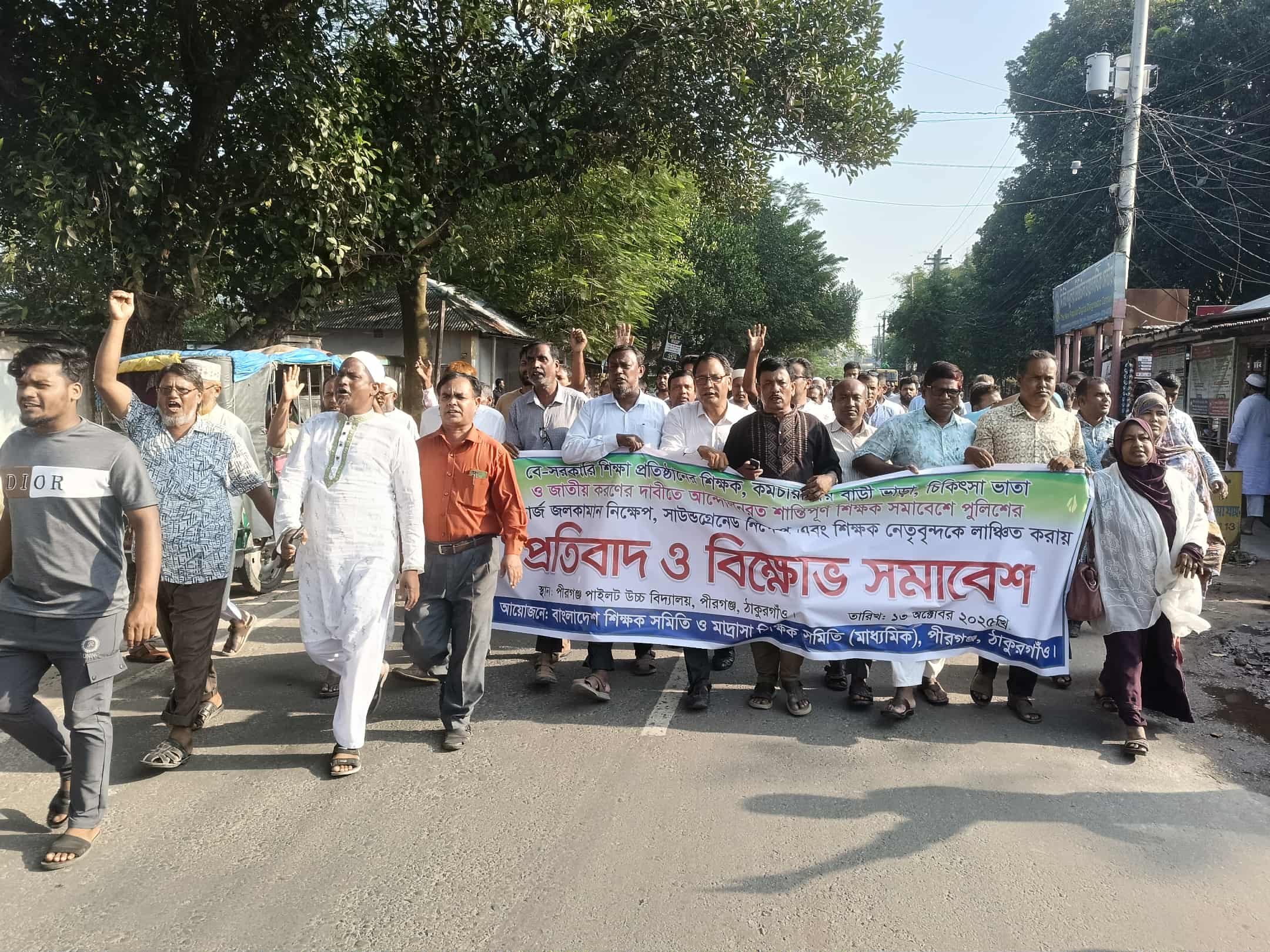 শেখ সমশের আলী, পীরগঞ্জ, ঠাকুরগাঁও, প্রতিনিধি।। সোমবার পীরগঞ্জ উপজেলার মাধ্যমিক স্কুল শিক্ষক ও মাদ্রাসার শিক্ষকরা শহরে প্রতিবাদ ও বিক্ষোভ সমাবেশ করেন। পীরগঞ্জ শহরের প্রাণ কেন্দ্রে অবস্থিত পাইলট উচ্চ বিদ্যালয় প্রাঙ্গনে বিকেলে শিক্ষকরা জমায়েত হয়ে শহরে প্রতিবাদ ও বিক্ষোভ সমাবেশ করেন। বে—সরকারি শিক্ষা প্রতিষ্ঠানের শিক্ষক কর্মচারীদের বাড়ি ভাড়া, চিকিৎসা ভাতা ও প্রতিষ্ঠান জাতীয় করণের দাবীতে আন্দোলনরত শান্তিপূর্ণ শিক্ষক সমাবেশে পুলিশের লাঠি চার্জ, জল কামান নিক্ষেপ, সাউন্ড গ্রেনেড নিক্ষেপ এবং শিক্ষক নেতৃবৃন্দকে লাঞ্চিত করার প্রতিবাদে পীরগঞ্জের শিক্ষক সমাজ এ প্রতিবাদ ও বিক্ষোভ সমাবেশ করেন। সমাবেশে নেতৃত্ব দেন শিক্ষক যথাক্রমে মোঃ আমিনুল হক মাস্টার, মোহাম্মদ আলম, মোঃ শাহজালাল সাজু, মোঃ হুমায়ুন কবির, মোঃ বকুল আলম, মোঃ কাওসার আলী প্রমুখ।