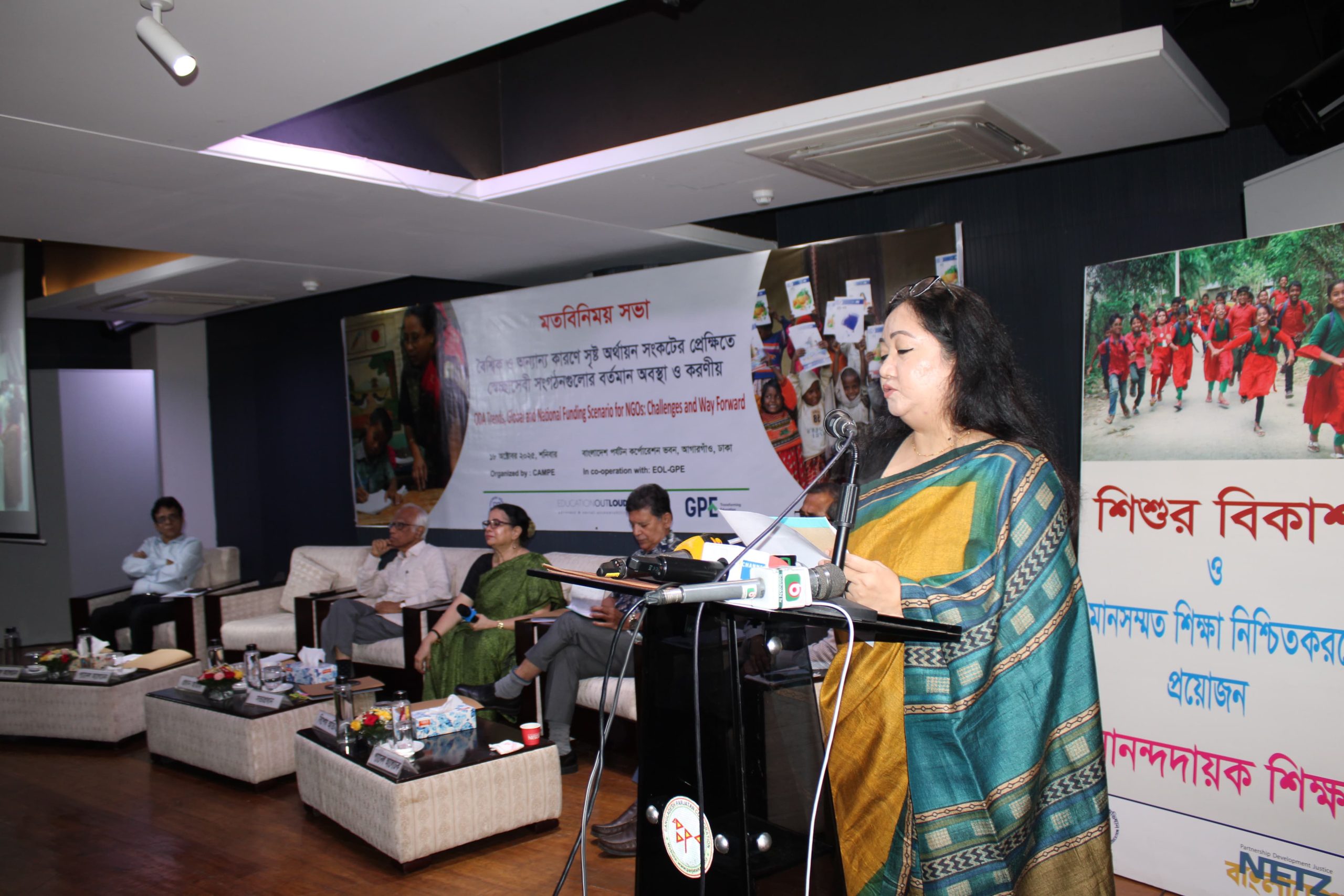 ঢাকায় বৈশ্বিক অর্থায়ন সংকটের প্রেক্ষিতে এনজিওদের বর্তমান অবস্থা ও করণীয় বিষয়ক মতবিনিময় সভা ১৮ অক্টোবর ২০২৫ শনিবার সকাল ১১টায় গণসাক্ষরতা অভিযানের আয়োজনে জিপিই এর সহযোগিতায় ঢাকার আগারগাঁওস্থ বাংলাদেশ পর্যটন কর্পোরেশন এর শৈলপ্রপাত হলরুমে ‘বৈশ্বিক ও অন্যান্য কারণে সৃষ্ট অর্থায়ন সংকটের প্রেক্ষিতে বাংলাদেশে স্বেচ্ছাসেবী সংগঠনগুলোর বর্তমান অবস্থা ও করণীয়’ শীর্ষক এক মতবিনিময় সভার আয়োজন করা হয়েছে। স্বেচ্ছাসেবী সংগঠন/এনজিওদের উন্নয়ন চলমান অর্থায়ন সংকট উত্তরণে সম্ভাব্য সমাধান, করণীয় ও কৌশল খুঁজে বের করতে আজকের এই আয়োজন ছিল। সভার শুরুতেই ফিলিস্তিনে শিশু, নারী ও বেসামরিক নাগরিক হত্যার প্রতিবাদ ও বিচার দাবি করে এবং ফিলিস্তিনিদের স্বাধীন রাষ্ট্র হিসেবে আন্তর্জাতিক স্বীকৃতি দাবি করে তাঁদের সাথে একাতœতা প্রকাশ করে অভিযানের সহকর্মীদের বিভিন্ন শিক্ষা প্রতিষ্ঠানে অধ্যয়নরত শিশু সন্তানেরা। বাংলাদেশ ও ফিলিস্তিনের পতাকা হাতে নিয়ে তারা স্লোগান দেয় এবং একটি ঘোষণাপত্র পাঠ করা হয়। এটি পাঠ করেন শিক্ষার্থী সুকৃতি ইসলাম জয়িতা।