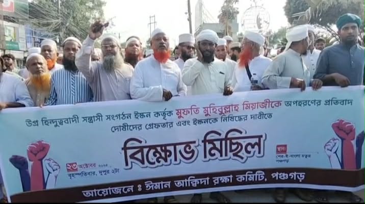 নিজস্ব প্রতিনিধি,পঞ্চগড় : উগ্র হিন্দুত্ববাদী সন্ত্রাসী সংগঠন ইস্কন কর্তৃক মুফতি মুহিবুল্লাহ মিয়াজীকে অপহরণের প্রতিবাদ দোষীদের গ্রেফতার এবং ইস্কনকে নিষিদ্ধের দাবীতে পঞ্চগড়ে বিক্ষোভ মিছিল ও সমাবেশ করেছে ঈমান আক্কিদা রক্ষা কমিটি।