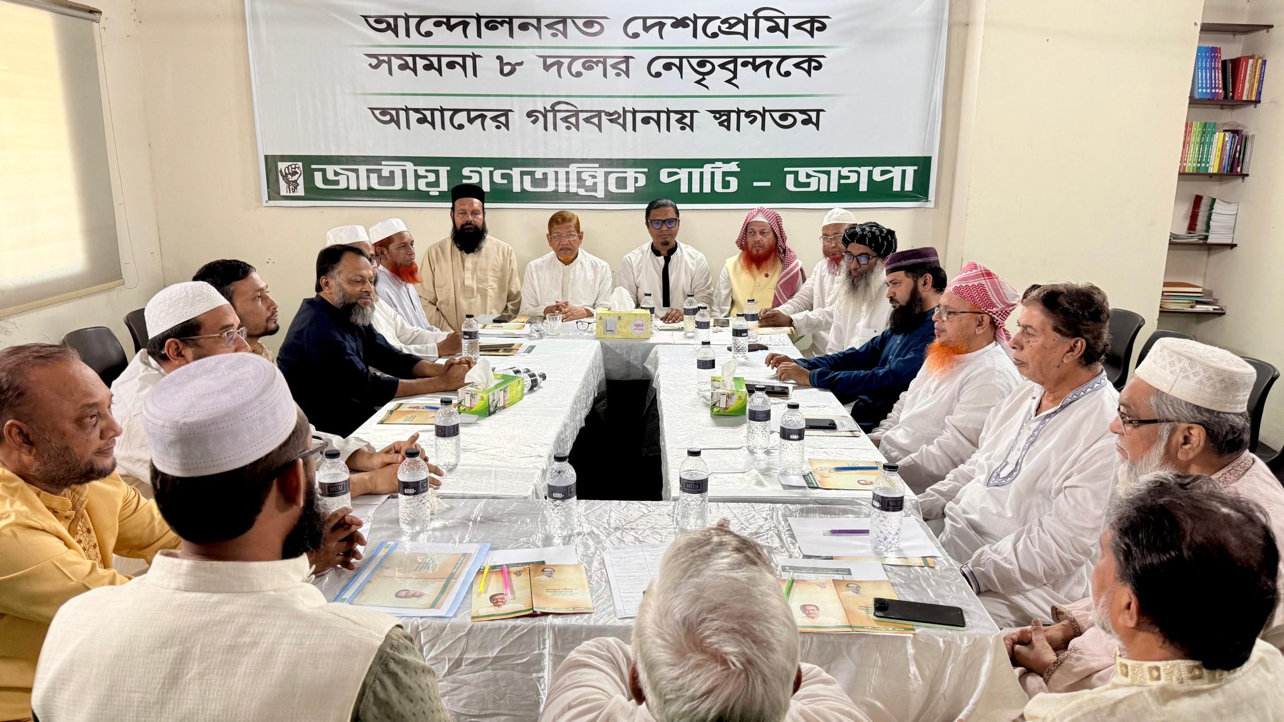 জাগপা সহ-সভাপতি ও দলীয় মুখপাত্র রাশেদ প্রধান-এর সভাপতিত্বে ৮ দলের লিয়াজো কমিটির বৈঠকে বক্তব্য রাখেন বাংলাদেশ জামায়াতে ইসলামীর সহকারী সেক্রেটারি জেনারেল হামিদুর রহমান আজাদ, ইসলামী আন্দোলন বাংলাদেশের প্রেসিডিয়াম সদস্য আশরাফ আলী আকন্দ, বাংলাদেশ খেলাফত মজলিসের যুগ্ন মহাসচিব আতাউল্লাহ আমিন, খেলাফত মজলিসের সিনিয়র নায়েবে আমির সাখাওয়াত হোসাইন ও যুগ্ন মহাসচিব মোস্তাফিজুর রহমান ফয়সাল, বাংলাদেশ নেজামে ইসলাম পার্টির মহাসচিব মুসা বিন ইজহার চৌধুরী ও সিনিয়র নায়েবে আমির আব্দুল মাজেদ আতাহারী, বাংলাদেশ খেলাফত আন্দোলনের মহাসচিব ইউসুফ সাদেক হাক্কানি ও নায়েবে আমির মুজিবুর রহমান হামিদী, জাগপা সাধারণ সম্পাদক অধ্যাপক ইকবাল হোসেন, বাংলাদেশ ডেভেলপমেন্ট পার্টির স্থায়ী কমিটির সদস্য আবু নাসের নূর নবী জনি ও অর্থ সম্পাদক রিয়াজ হোসাইন।