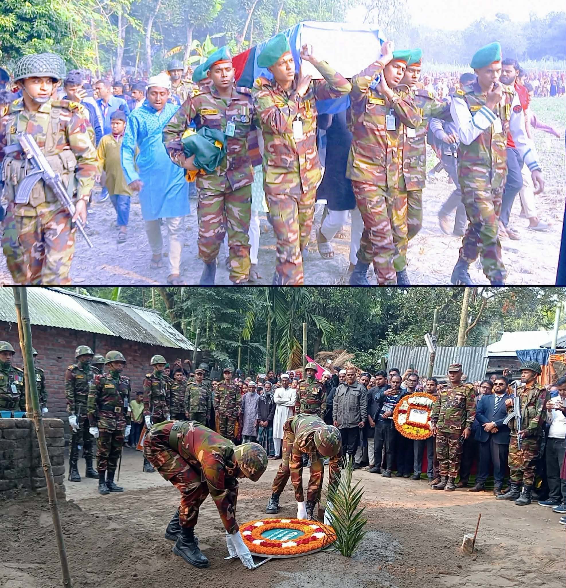 ফজলার রহমান গাইবান্ধা প্রতিনিধি:--সুদানের আবেই এলাকায় জাতিসংঘের (ইউএন) শান্তিরক্ষা মিশনের আওতাধীন একটি ঘাঁটিতে সন্ত্রাসী ড্রোন হামলায় শহীদ বাংলাদেশ সেনাবাহিনীর শান্তিরক্ষী সবুজ মিয়ার মরদেহ তার নিজ বাড়িতে পৌঁছেছে। প্রিয় মানুষটিকে শেষ বিদায় জানাতে গ্রামের বাড়িতে জানাজা ও দাফনের প্রস্তুতি শেষে লাশ দাফন করেছে স্বজনরা।