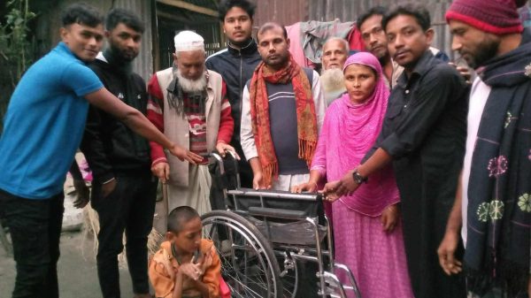 পলাশবাড়ীতে ইউনিয়ন যুবদলের পক্ষ থেকে প্রতিবন্ধীকে হুইলচেয়ার উপহার
