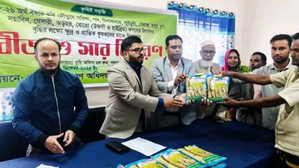 পলাশবাড়ীতে ক্ষুদ্র ও প্রান্তিক কৃষকের মাঝে বিনামূল্যে বীজ–সার বিতরণ
